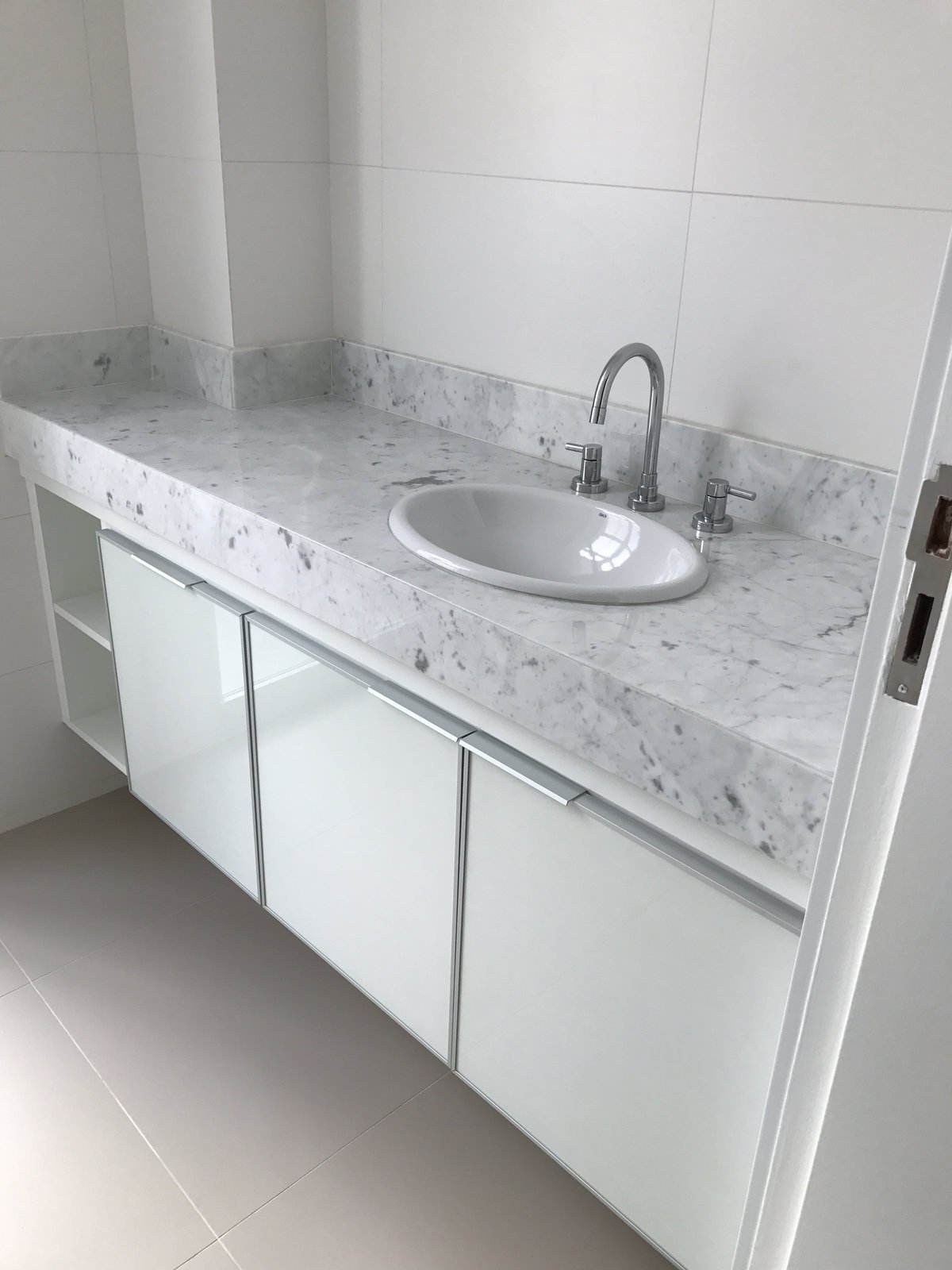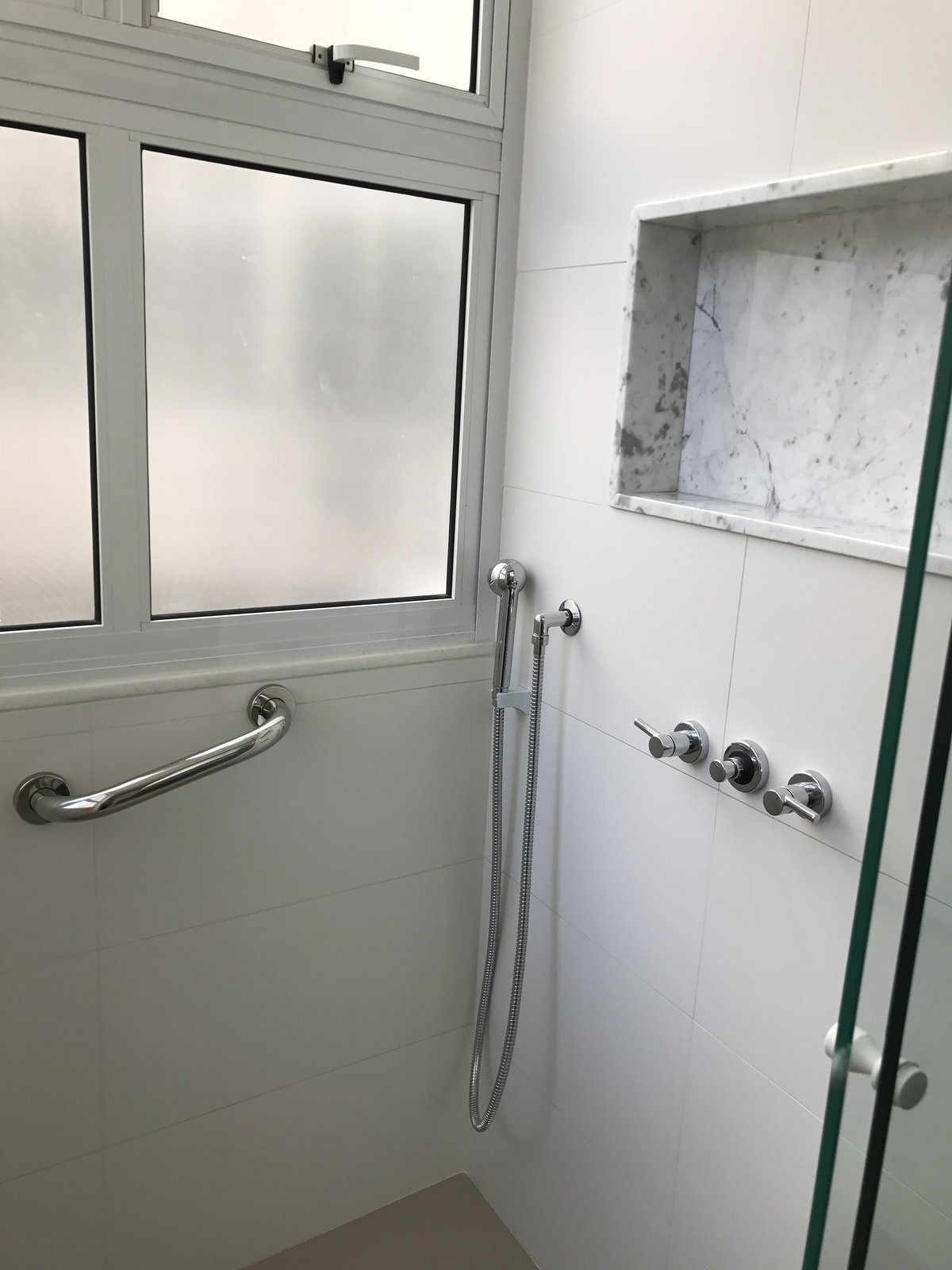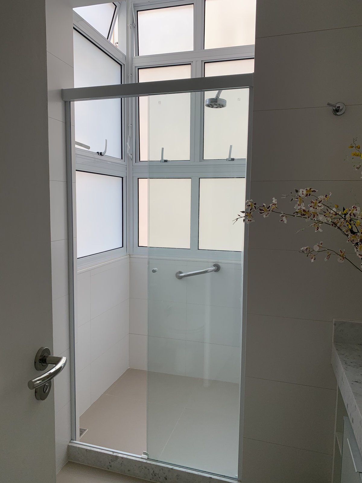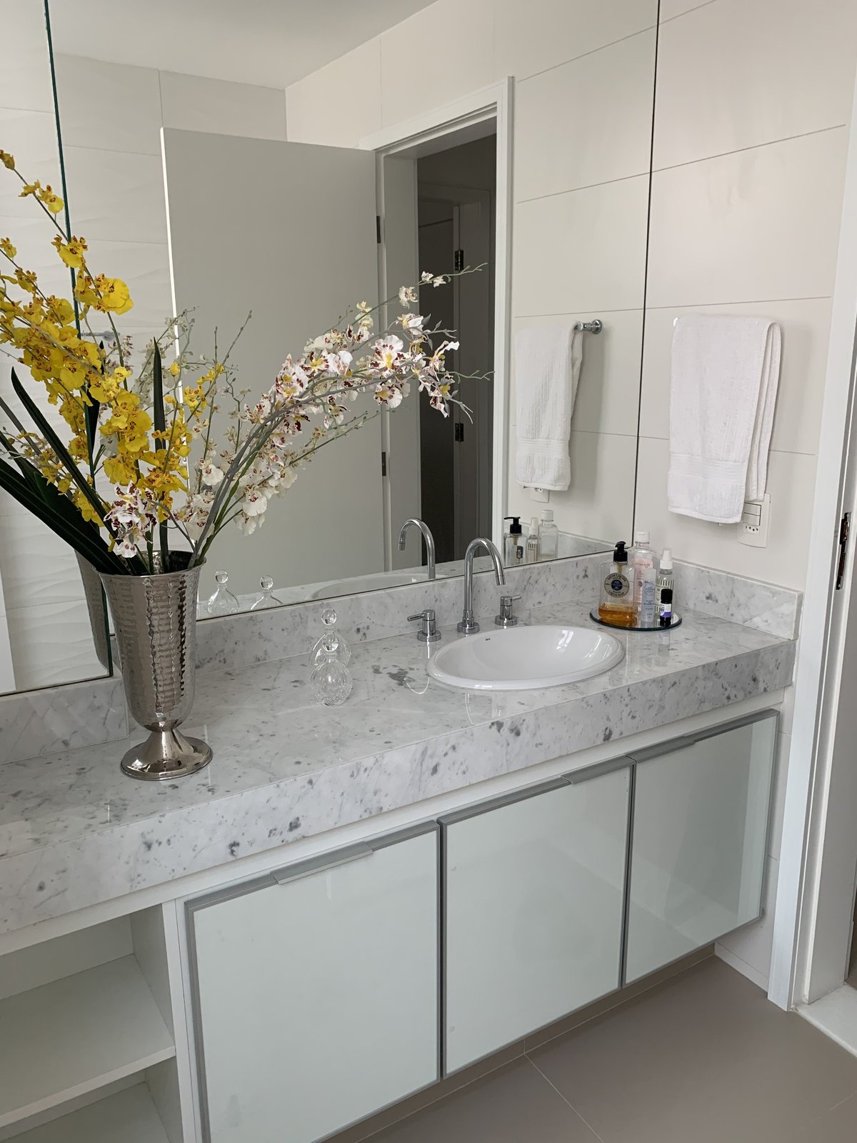 No banheiro, ampliamos a sensação de espaço com janelas dentro do box e revestimentos claros, que refletem a luz e ampliam a percepção do ambiente. Cada detalhe foi pensado para criar amplitude, conforto e bem-estar no dia a dia.